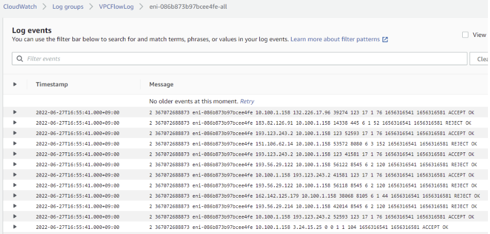 | action | ACCEPT : 보안 그룹 및 네트워크 ACL에서 허용한 기록된 트래픽 REJECT : 보안 그룹 또는 네트워크 ACL에서 허용하지 않은 트래픽 |