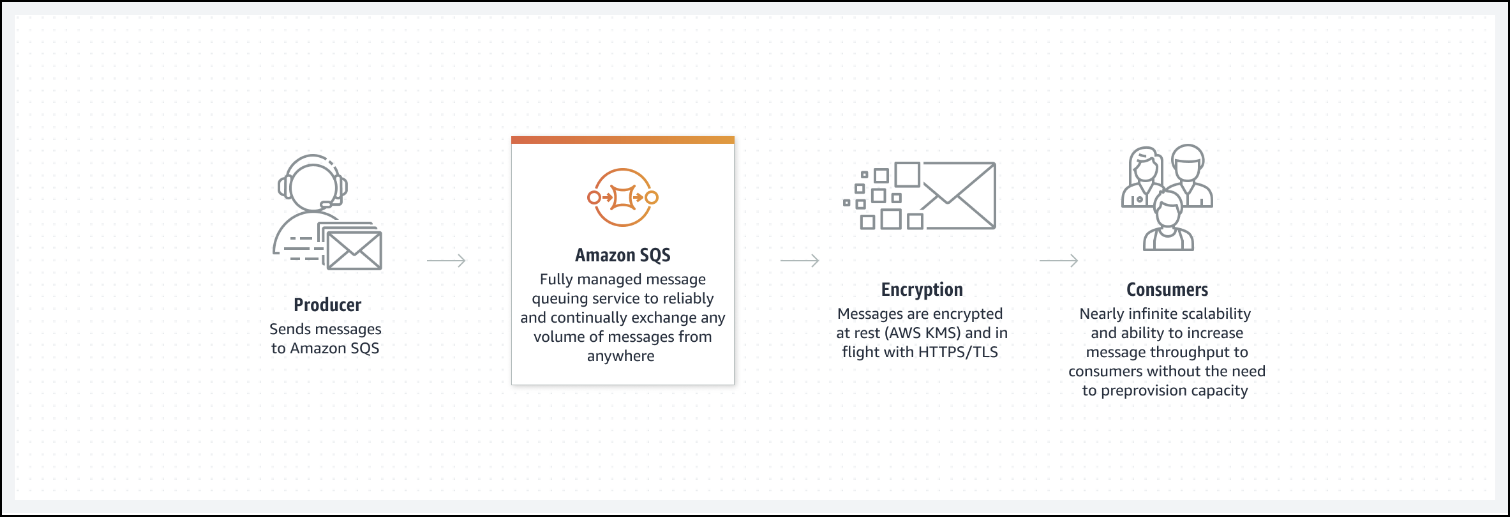 Amazon SQS는 고객이 대기열을 사용하여 구성 요소(마이크로서비스)를 분리하고 연결할 수 있는 간단하고 안정적인 방법을 제공합니다.