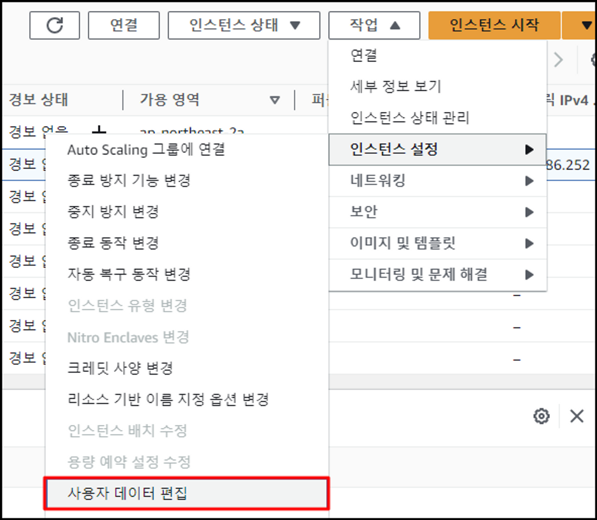2. 인스턴스 선택 > 인스턴스 설정 > 사용자 데이터 편집으로 간 다음