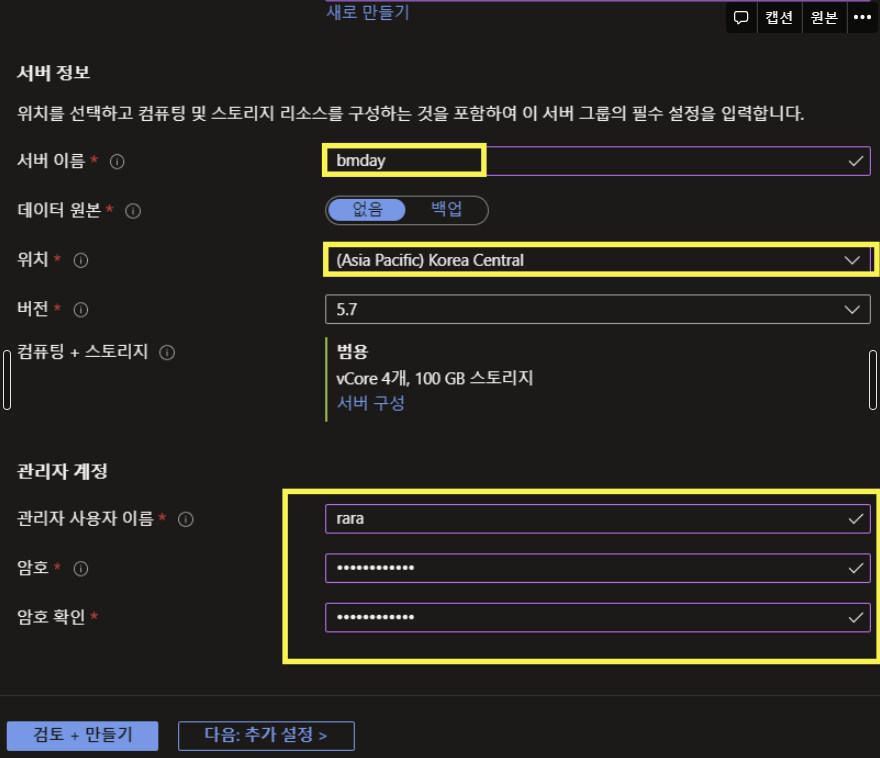 서버이름을 정해주고, 위치와 관리자계정을 설정해줍니다.