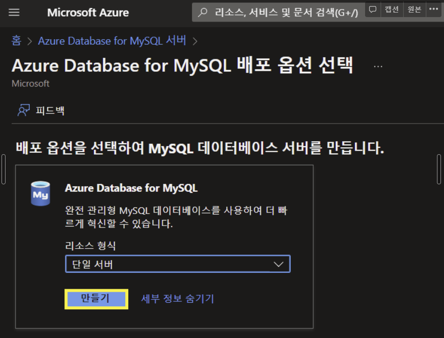 이전에 만들어 두었던 리소스그룹에 이어서 DB를 생성해주겠습니다. 저희는 간단한 구축만을 원하기 때문에 단일 서버로 설정해줍니다.