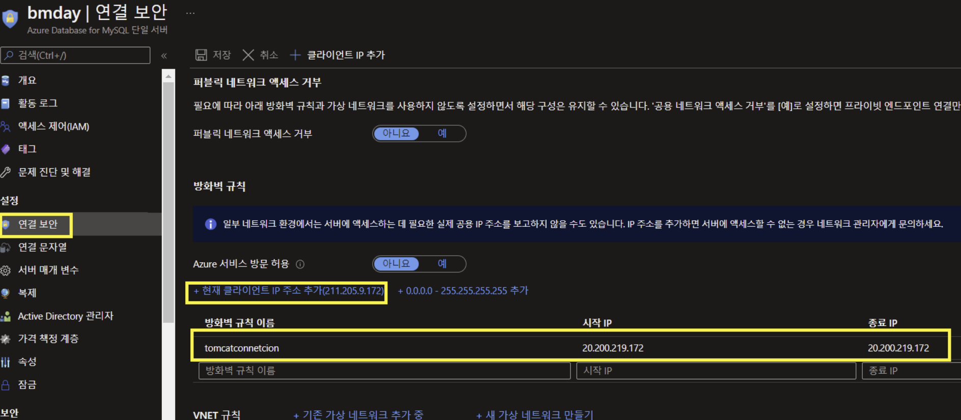 '현재 클라이언트 IP주소 추가' 또는 바로 밑의 '방화벽 규칙 이름' 칸에 새로 방화벽 규칙을 설정해주면 접속이 됩니다.