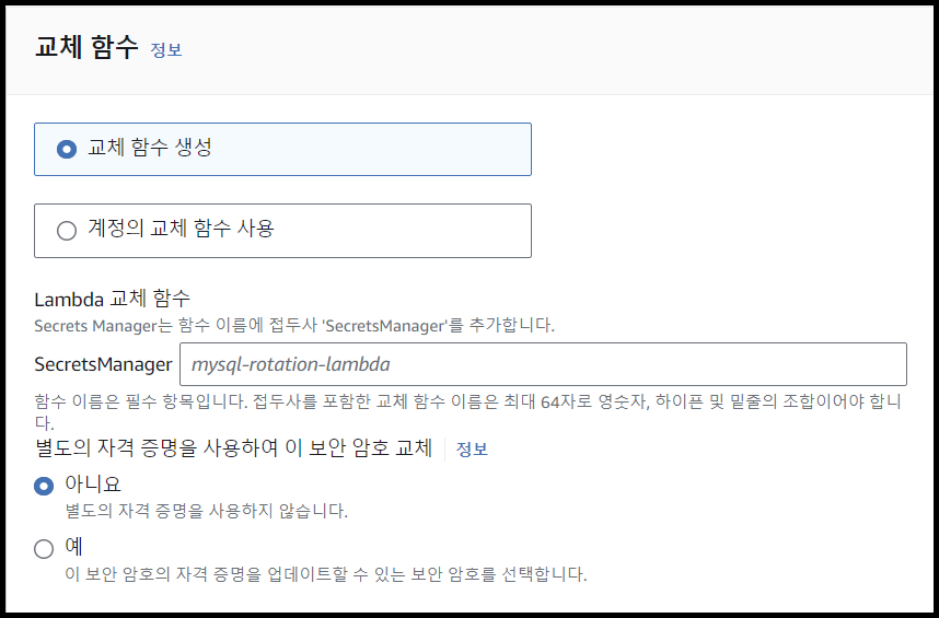 Secrets Manager에 저장될 보안 암호의 정보를 설정합니다.
