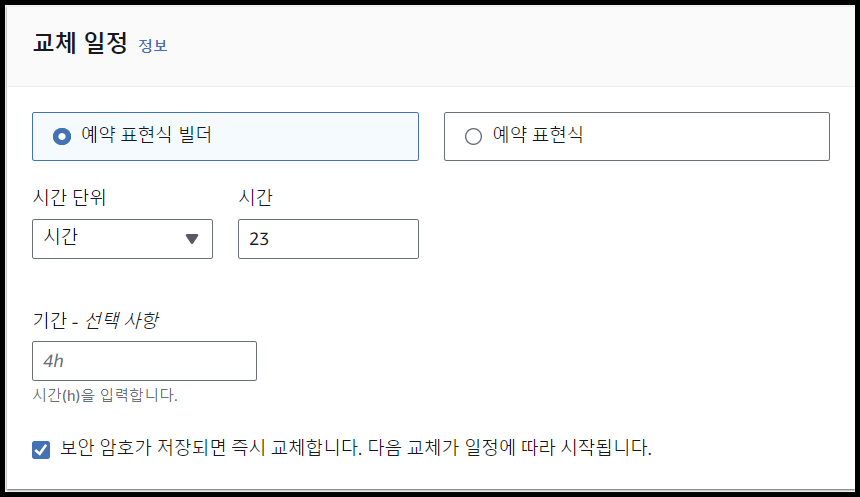 원하는 교체 일정을 설정합니다. 시간단위는 시간, 일, 주, 월을 선택 가능합니다. 예약 표현식 빌더를 통해 선택을 통해 설