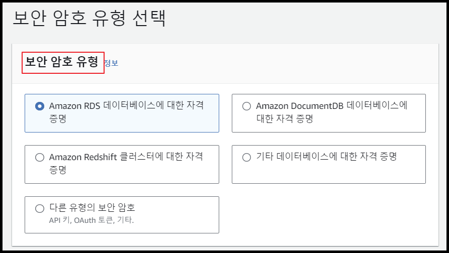 Secrets Manager에 저장되어 사용될 보안 암호의 유형을 선택합니다.