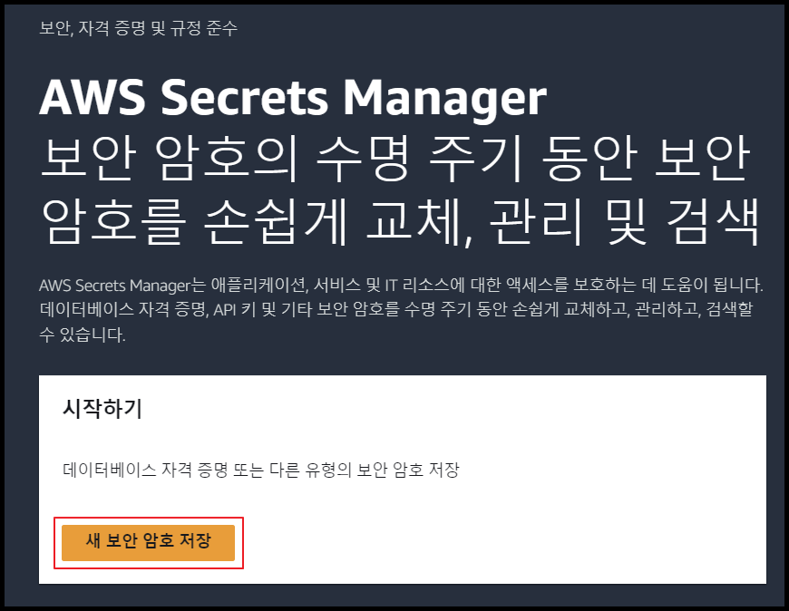 AWS Secrets Manager 페이지에 들어가 ‘새 보안 암호 저장’을 선택합니다.