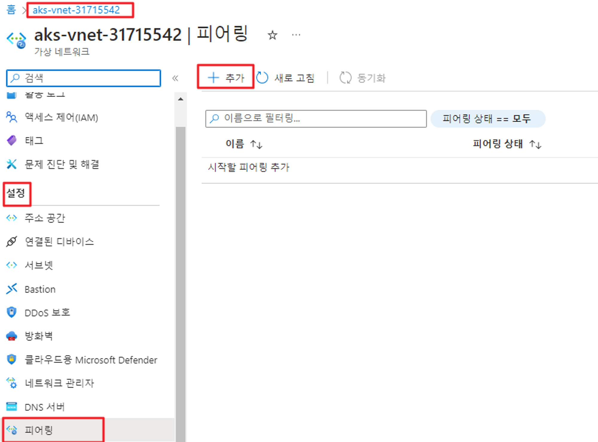가상네트워크 → aks-vnet → 피어링에 들어가 피어링을 추가를 합니다.