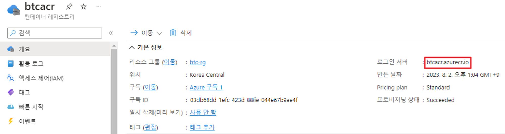 azure login 후 az acr 연결을 진행합니다.