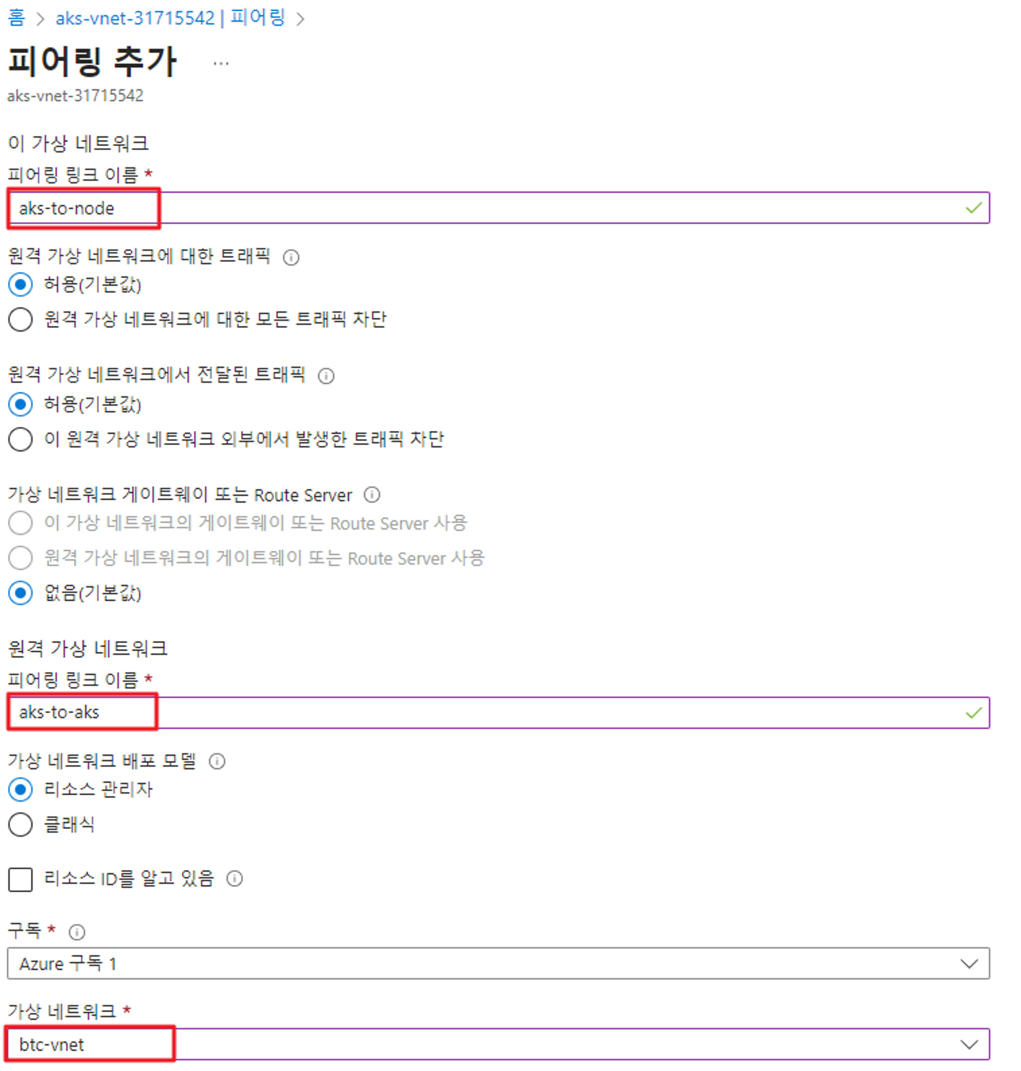 이 가상 네트워크의 피어링 링크 이름은 aks-to-node로 설정하고,