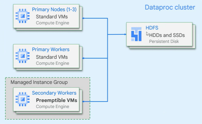 - 이 저렴한 가격 외에도 Dataproc 클러스터에는 컴퓨팅 가격이 더 낮은 선점형 인스턴스를 포함하여 비용을 더 줄일 수 있습니다.