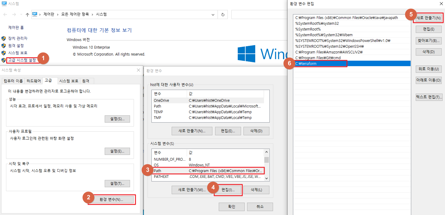 내컴퓨터 속성 > 고급 시스템 설정 > 환경변수 Path 편집 > 새로만들기 "테라폼 경로" 등록