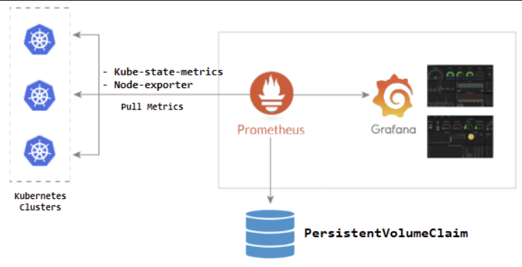 - 프로메테우스에서 GKE의 메트릭을 Pull 방식으로 가져와 Grafana의 대시보드로 시각화하여 제공하게 됩니다.