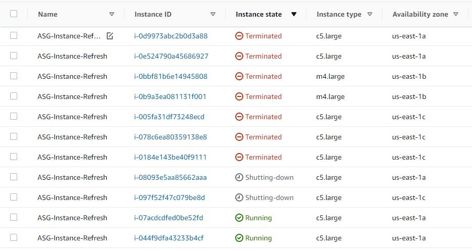 3. Amazon EC2 Auto Scaling은 인스턴스의 롤링 대체 수행을 시작. 이때, 인스턴스 집합의 서비스가 중단되어 종료되고 인스턴스 세트가 원하는 새 구성으로 시작됨. 그런 다음 인스턴스가 상태 확인을 통과하고 워밍업을 완료할 때까지 기다렸다가 다른 인스턴스를 대체로 진행함.