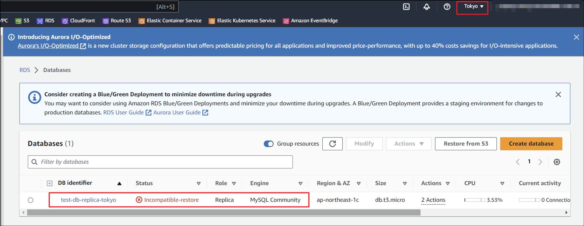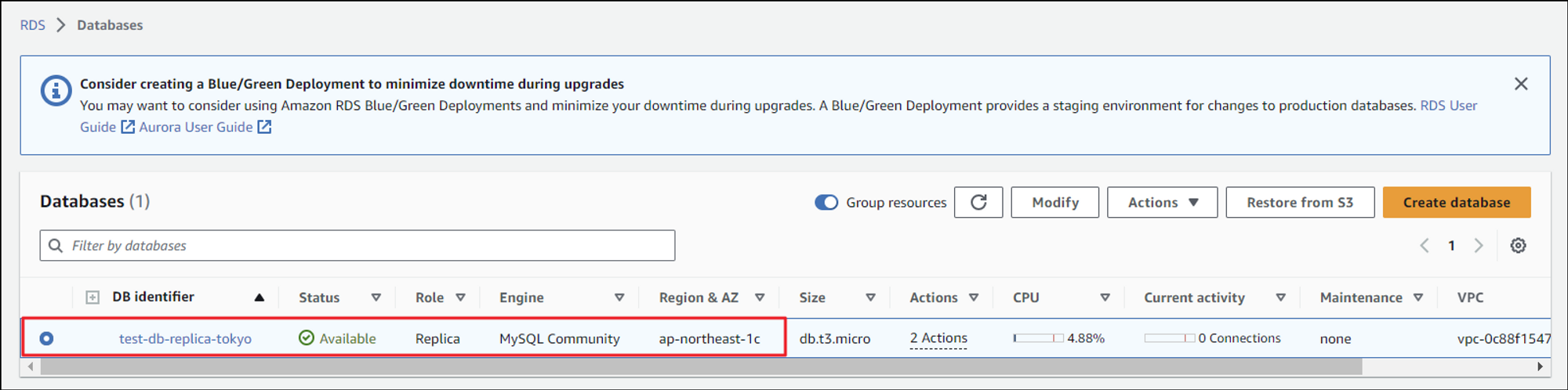 에러 없이 명령어가 잘 입력 되었다면, 콘솔을 통해 도쿄 리전에 Replica가 잘 생성이 되음을 확인할 수 있습니다.