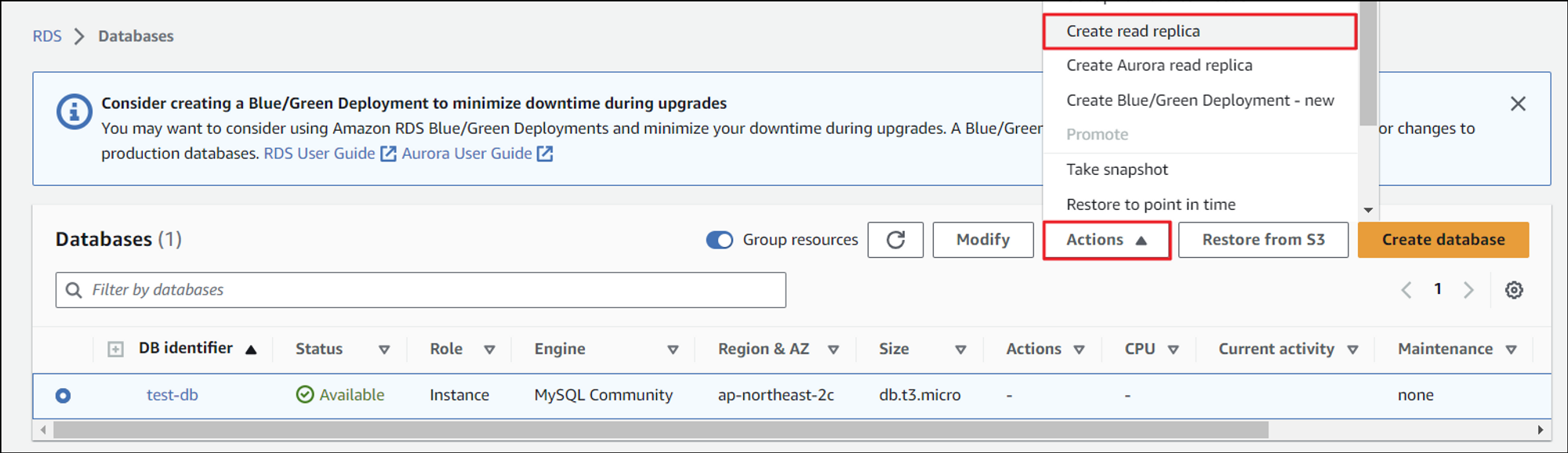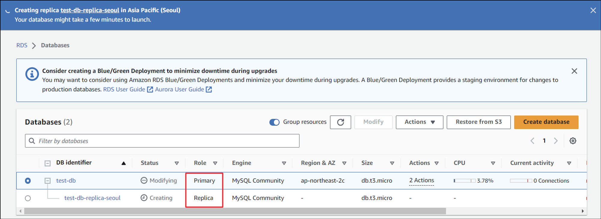 마찬가지로 create replica를 눌러주면 도쿄 리전에서 read replica 가 잘 만들어지고 있는 것을 확인할 수 있겠죠?