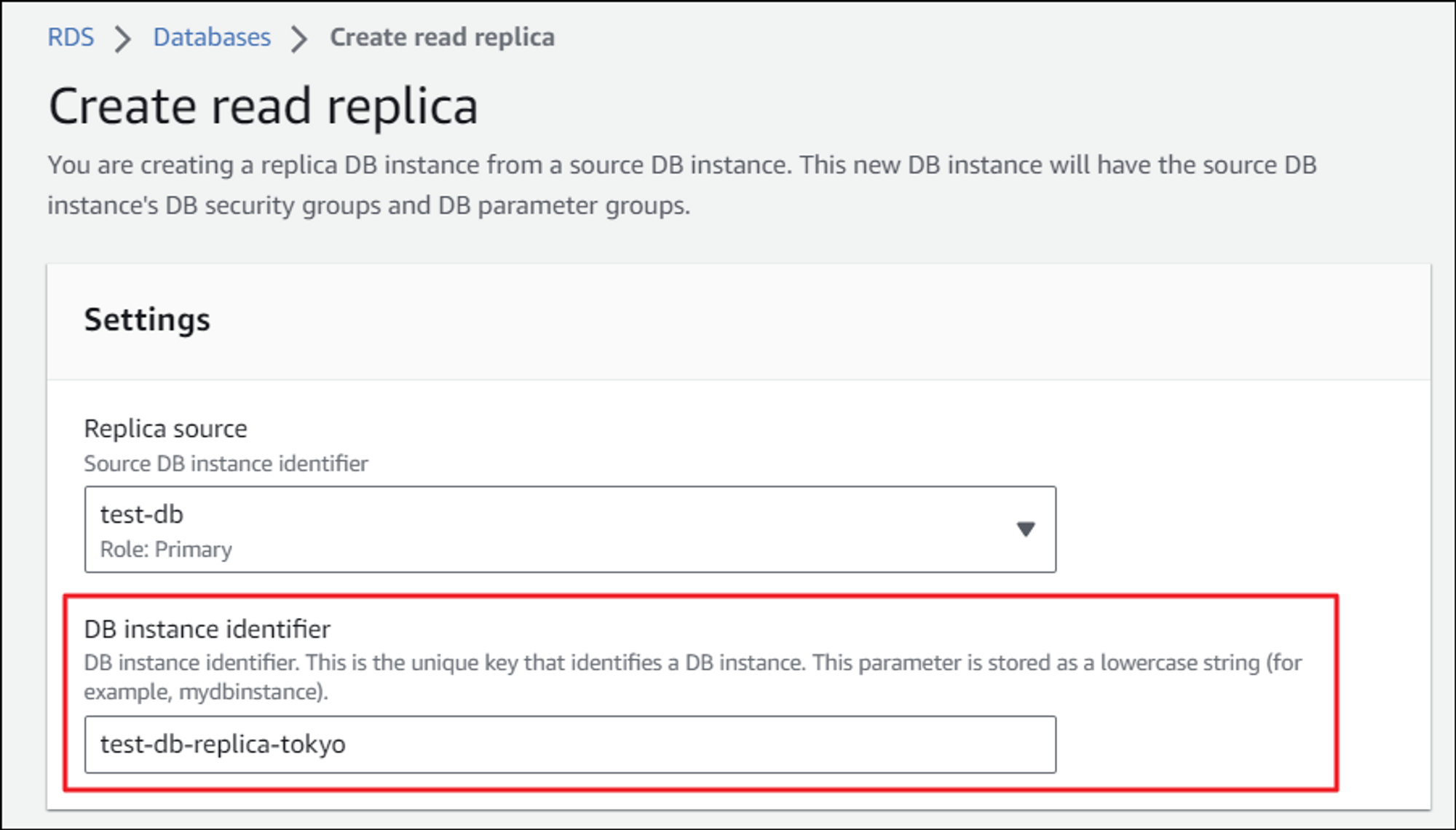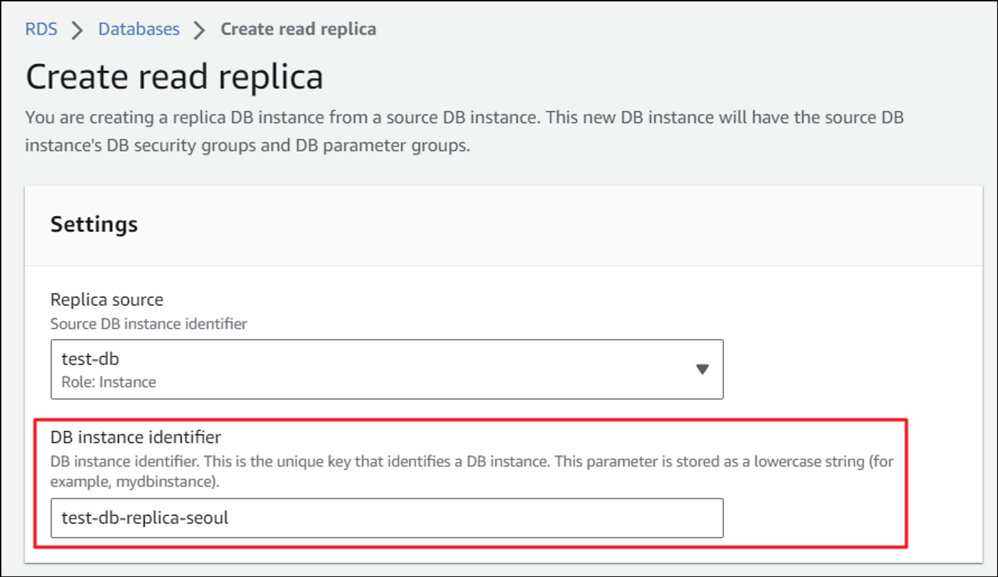 - Replica를 생성할 리전에도 소스DB와 같은 사용자 지정 파라미터 그룹(custom parameter group) 을 만들 것