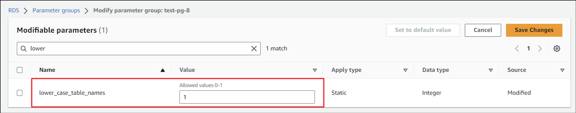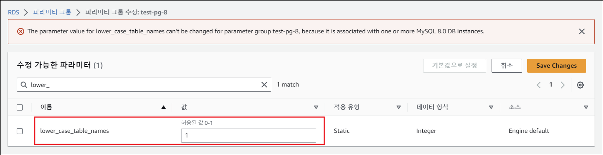 : RDS Console > Parameter groups > Edit > lower_case_table_names=1 수정 > Save Change