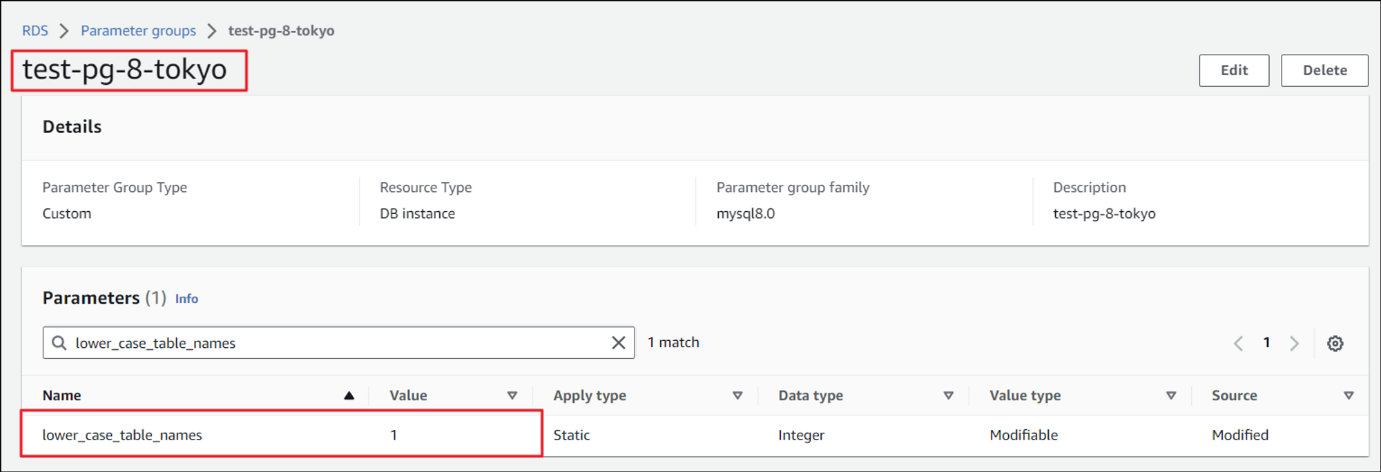 파라미터 그룹은 리전 상관없이 똑같이 콘솔 작업으로 가능하므로, 해당 리전에 파라미터 그룹을 만들고, lower_case_table_names 파라미터 값을 수정해줍니다.