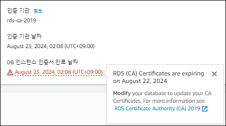 해당 내용은 Amazon RDS 인증 기관 인증서 rds-ca-2019는 2024년 8월에 만료되도록 설정되어 있으니 새 CA 인증서로 업데이트가 필요하다는 내용이었습니다