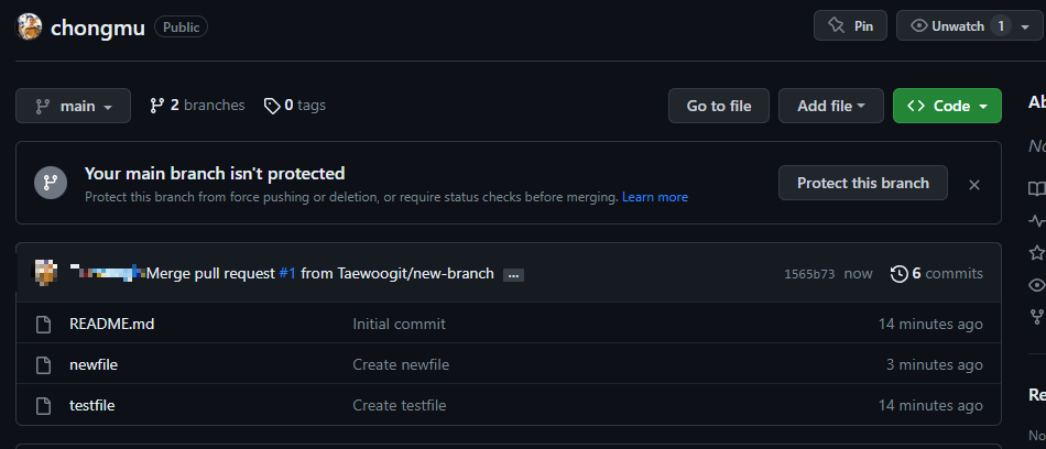 이렇게 main branch에도 newfile이 반영되게 됩니다!!