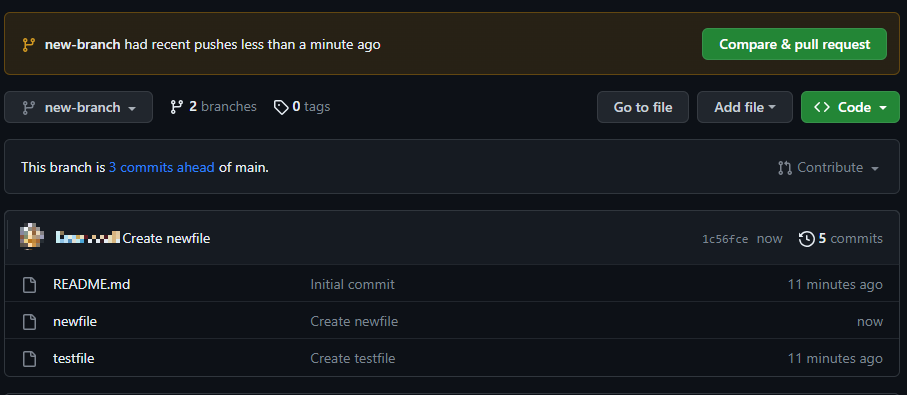 NEW Branch에 파일을 추가하자 위에 새로운 알림이 생긴것을 확인할 수 있습니다!!