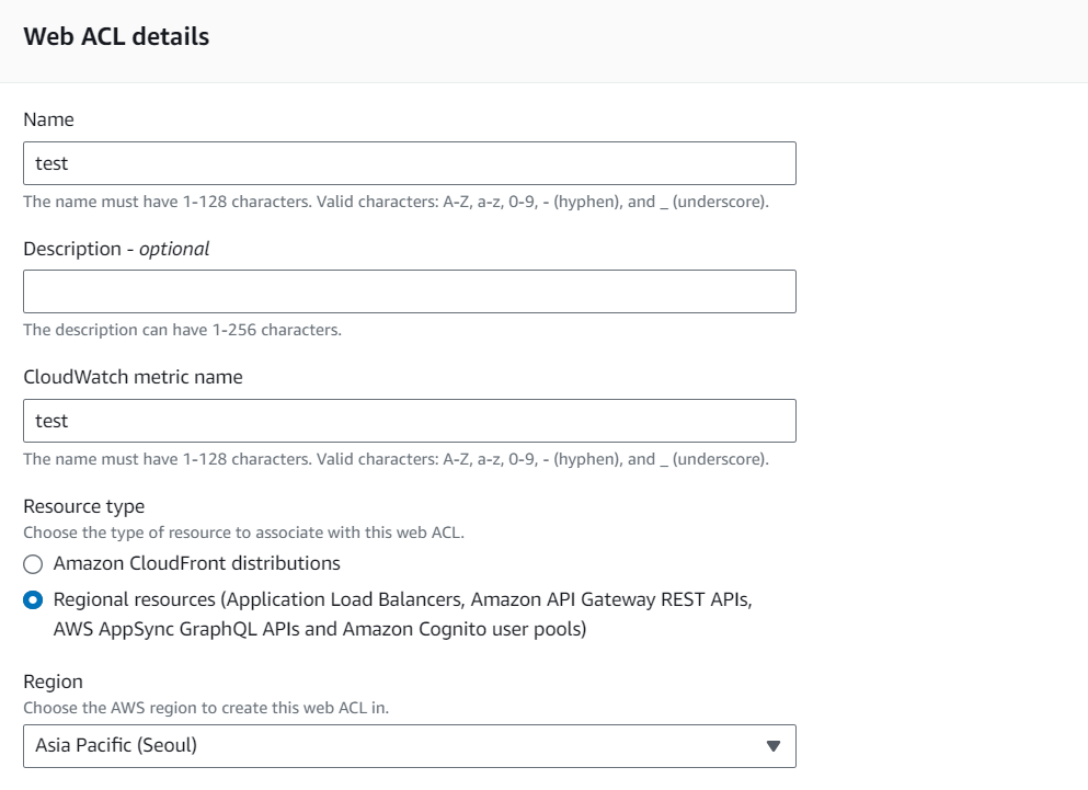 WAF의 이름과 함께 ACL를 생성할 리전, WAF를 적용시킬 리소스 타입을 선택합니다.