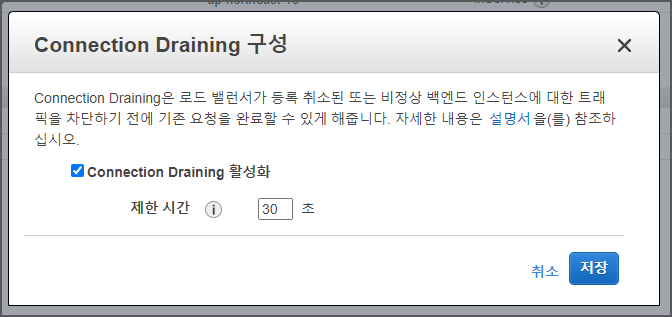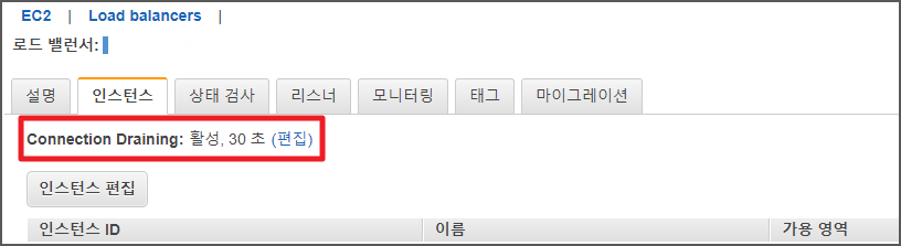 - 먼저 로드 밸런서에서 연결 드레이닝을 활성화합니다. 로드 밸런서가 기존 연결을 유지하는 시간 또한 설정해줍니다
