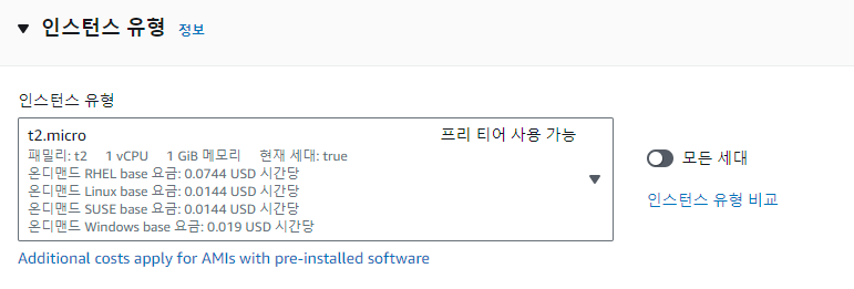 인스턴스 유형은 테스트용으로 t2.micro를 선택해줬어요.