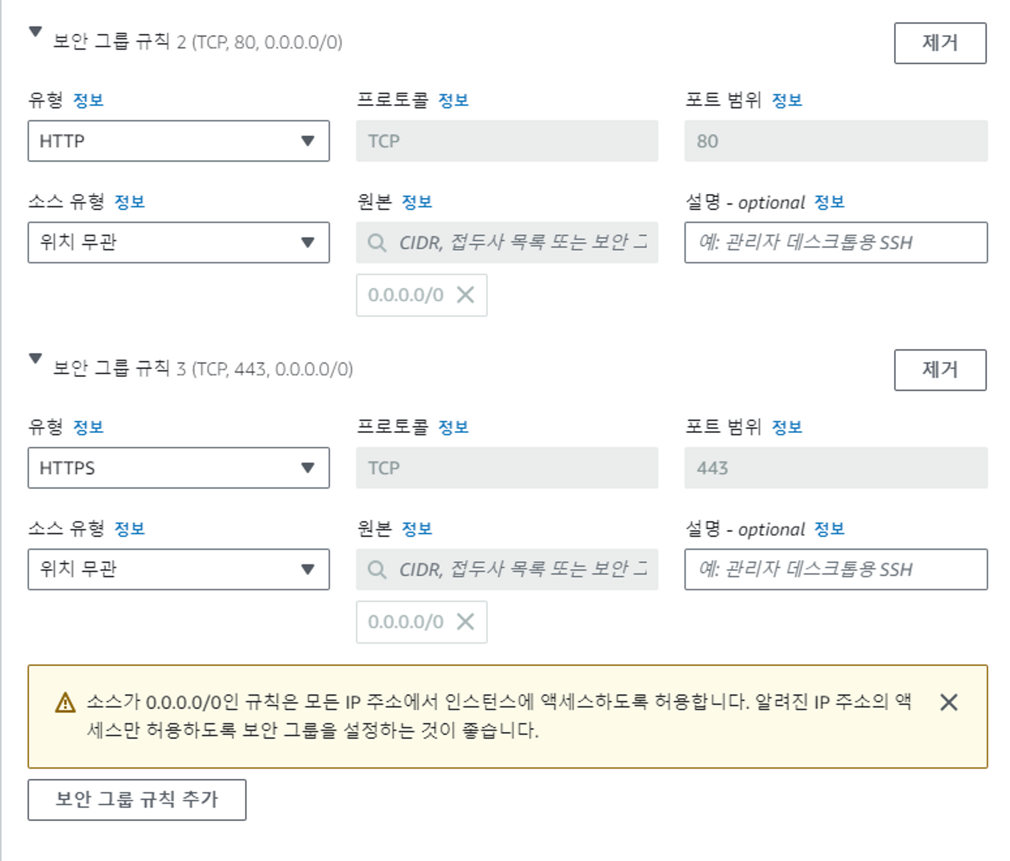 네트워크 설정 > 보안그룹에 ssh, http, https를 추가해줍니다.