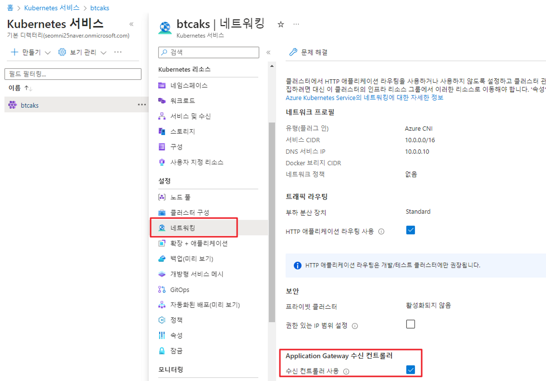 Kubernetes 서비스에서 해당 aks를 선택 후 네트워킹으로 이동합니다. 그리고 수신 컨트롤러 사용을 체크 해주면 됩니다!
