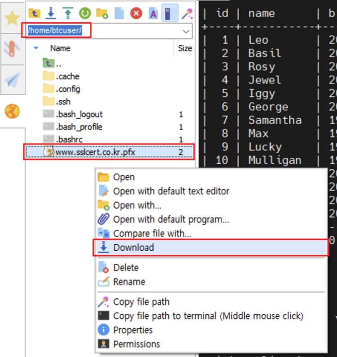 우선 키를 /home/btcuser에 옮기고 파일을 다운로드합니다.