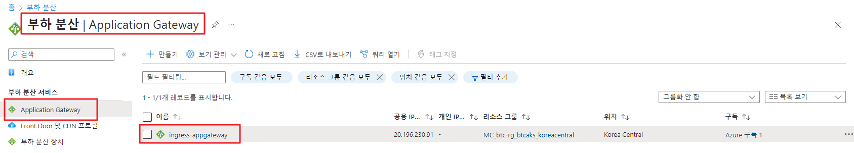 그러면 설정한 AGIC에 대해 ingress gateway가 자동적으로 생성됩니다!