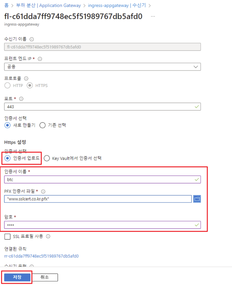 그 다음 키를 로컬 컴퓨터에 저장해놓고 Azure 콘솔로 가서 수신기에 해당 인증서를 넣어줍니다.