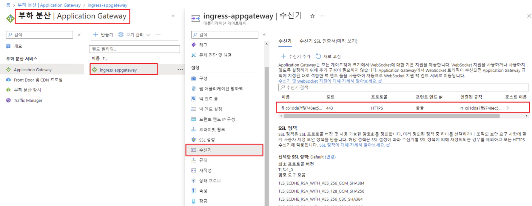 Azure 콘솔에서 Application Gateway로 들어가 ingress-appgateway > 수신기로 들어가면 만들어진 수신기가 있습니다.