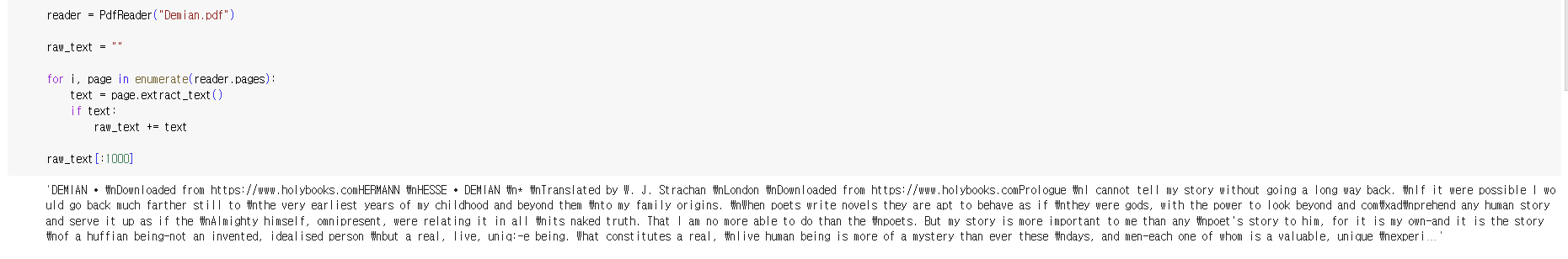 - PdfReader를 통해 pdf파일을 불러와 for문을 통해 모든 텍스트를 추출해내는 명령어