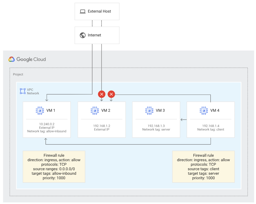 - Virtual Private Cloud(VPC) 방화벽 규칙이 특정 프로젝트 및 네트워크에 적용됩니다.
