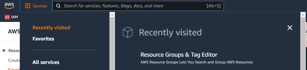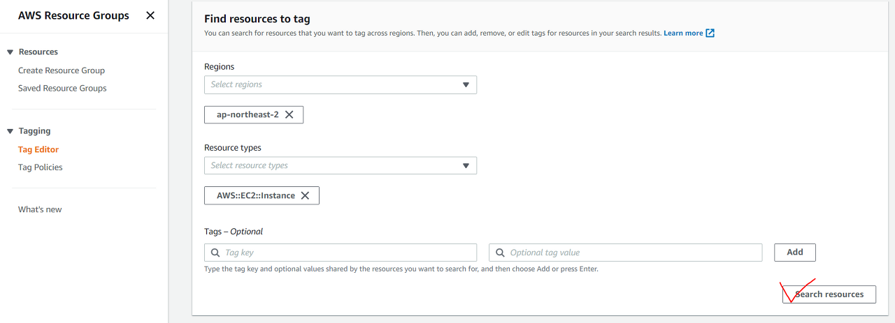 AWS 콘솔에 접속하여 왼쪽 상단의 Services클릭후 aws resource group & Tag Editor를 검색합니다.