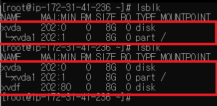SSH접속 화면에서 lsblk 명령어를 쳐보면 xvdf disk가 생긴 것을 볼 수 있습니다. (xvdf와 다를 수 있음)