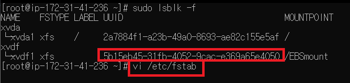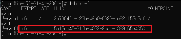 lsblk -f로 보면 xvdf 아래 xvdf1인 파티션 하나가 생성된 것을 알 수 있습니다.