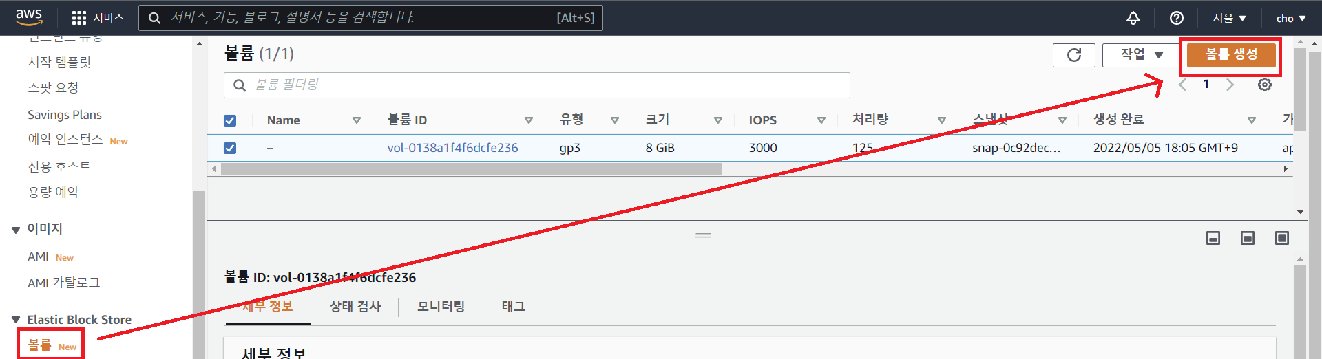 EC2 -> EBS 볼륨 -> 볼륨 생성 클릭