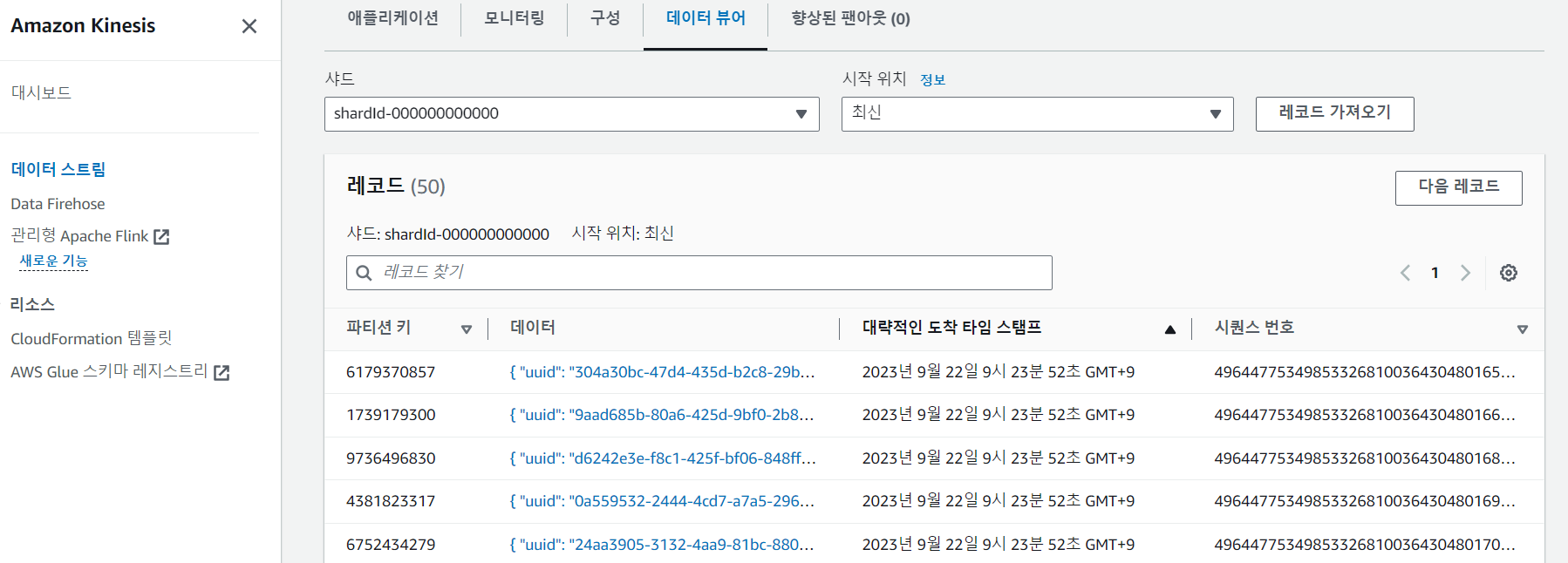 Kinesis Data Streams > iot-data-stream1을 클릭, 데이터 뷰어에서 샤드를 지정한 후 레코드를 가져와 확인합니다.