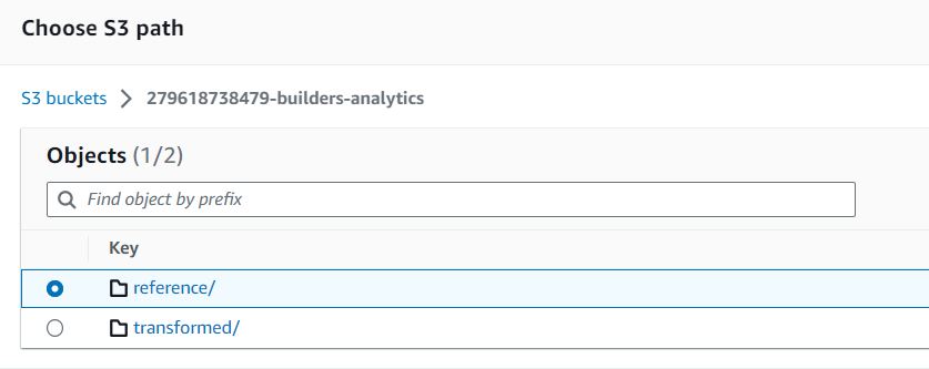 - s3 path : {AccountID}-builders-analytics/reference/