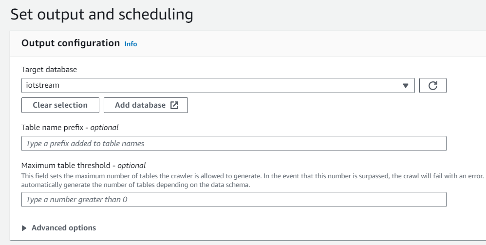 Glue Crawler를 실행하기 위한 IAM, Crawler를 통해 생성한 테이블이 속할 데이터베이스를 각각 지정합니다.