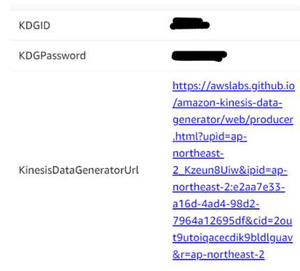 Cloudformation > Module1의 출력 에서 Kinesis Data Generator의 URL과 ID/Password를 확인할 수 있습니다.