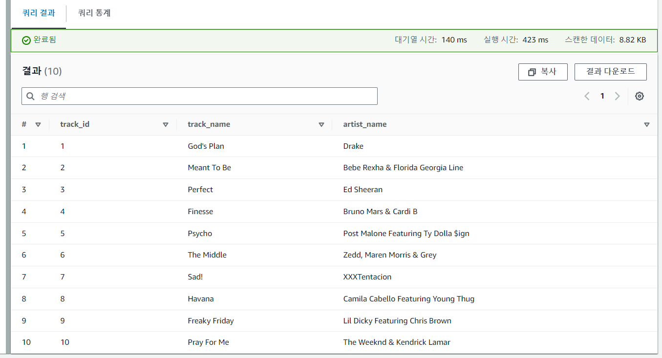 다시 Athena 편집기 메뉴로 돌아와 쿼리를 실행합니다. 하단의 쿼리 결과들이 나열되는 사항을 확인 할 수 있습니다.