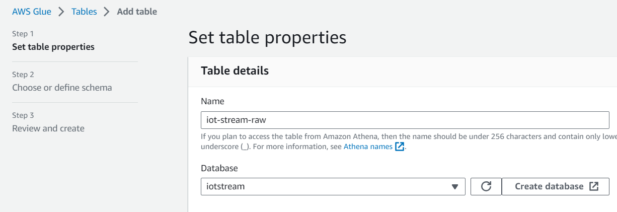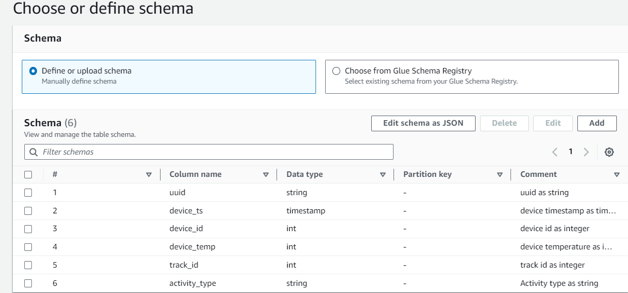 먼저 실시간 데이터를 처리하기 위한 데이터 스키마를 Glue Data Catalog에서 정의해야 합니다.