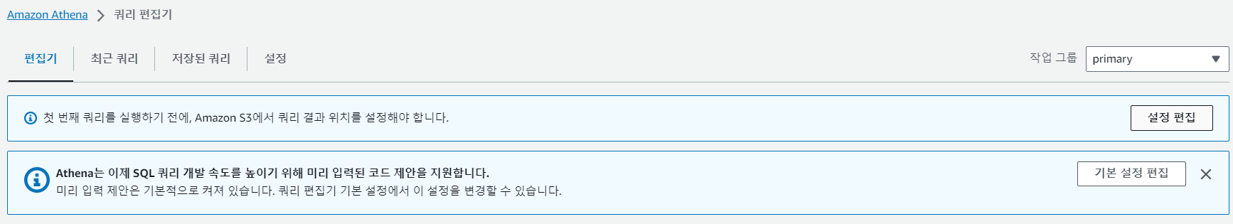 Athena를 통해 SQL 쿼리를 실행하기 이전에, 쿼리 결과를 저장할 공간을 선택해야 하므로 설정 편집을 합니다.
