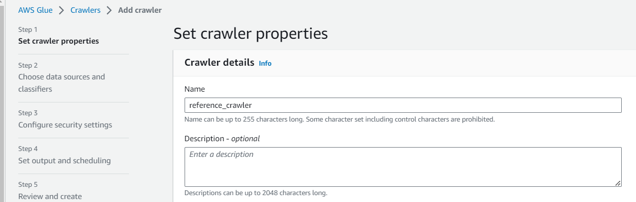 Glue > Create crawler 후 이름을 지정합니다.