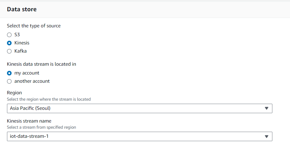 Stream/delivery stream(실시간 데이터를 보낼 곳) = iot-data-stream-1