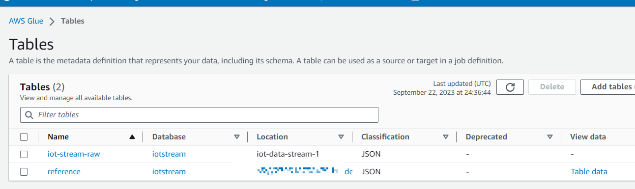 Glue - Data Catalog - Database - Table 메뉴로 이동하고 Refresh 버튼을 클릭합니다.